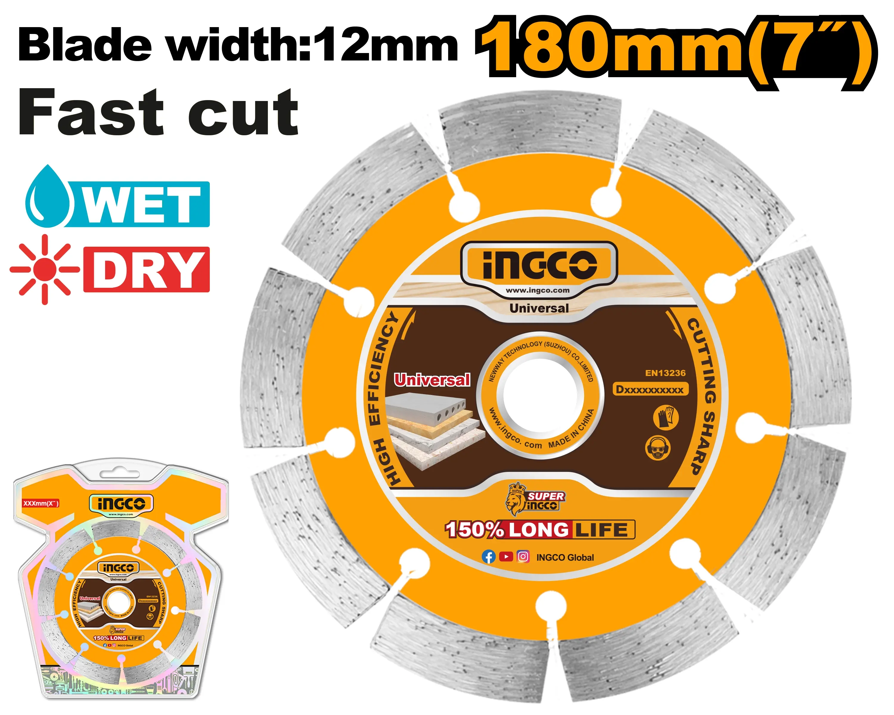 Tento řezný kotouč je ideální volbou pro náročné práce při řezání tvrdých materiálů, jako je kámen, beton, cihly, vápenec, žula a mramor. S průměrem 180 mm (7") a šířkou kotouče 10 mm zajišťuje kotouč vynikající výkon a dlouhou životnost při řezání. Je navržen pro použití s úhlovými bruskami a je vhodný pro mokré i suché řezání, což umožňuje flexibilitu v různých pracovních podmínkách. Tento kotouč je balen v barevné krabici, což zajišťuje bezpečné skladování a snadný přenos.