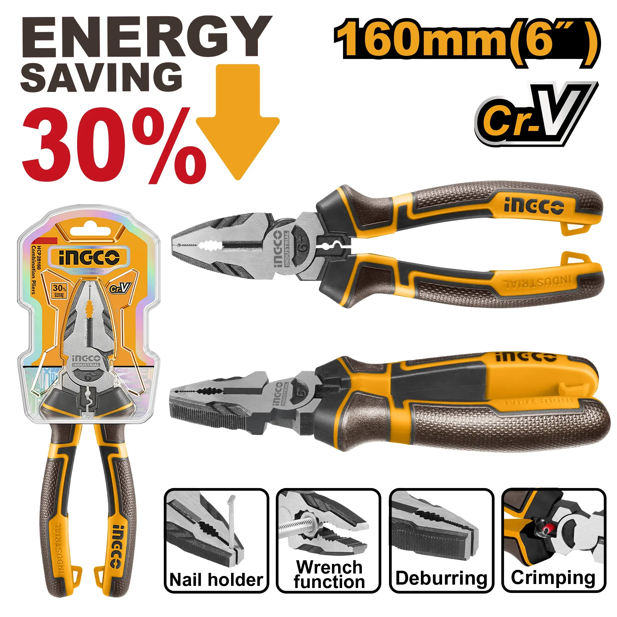Kleště o velikosti 160 mm (6") jsou vybaveny tříbarevnou gumovou rukojetí (TPR), která kombinuje pevnost a přilnavost pro ergonomický a bezpečný úchop. Efektivní design snižuje potřebný výkon o 30% ve srovnání se standardními kleštěmi, což šetří energii a snižuje únavu ruky. Nástroj je vybaven čtyřmi užitečnými funkcemi: stiskováním, držákem na hřebíky, funkci jako klíč a odstraňováním otřepů. Kleště jsou baleny v blistrovém obalu.