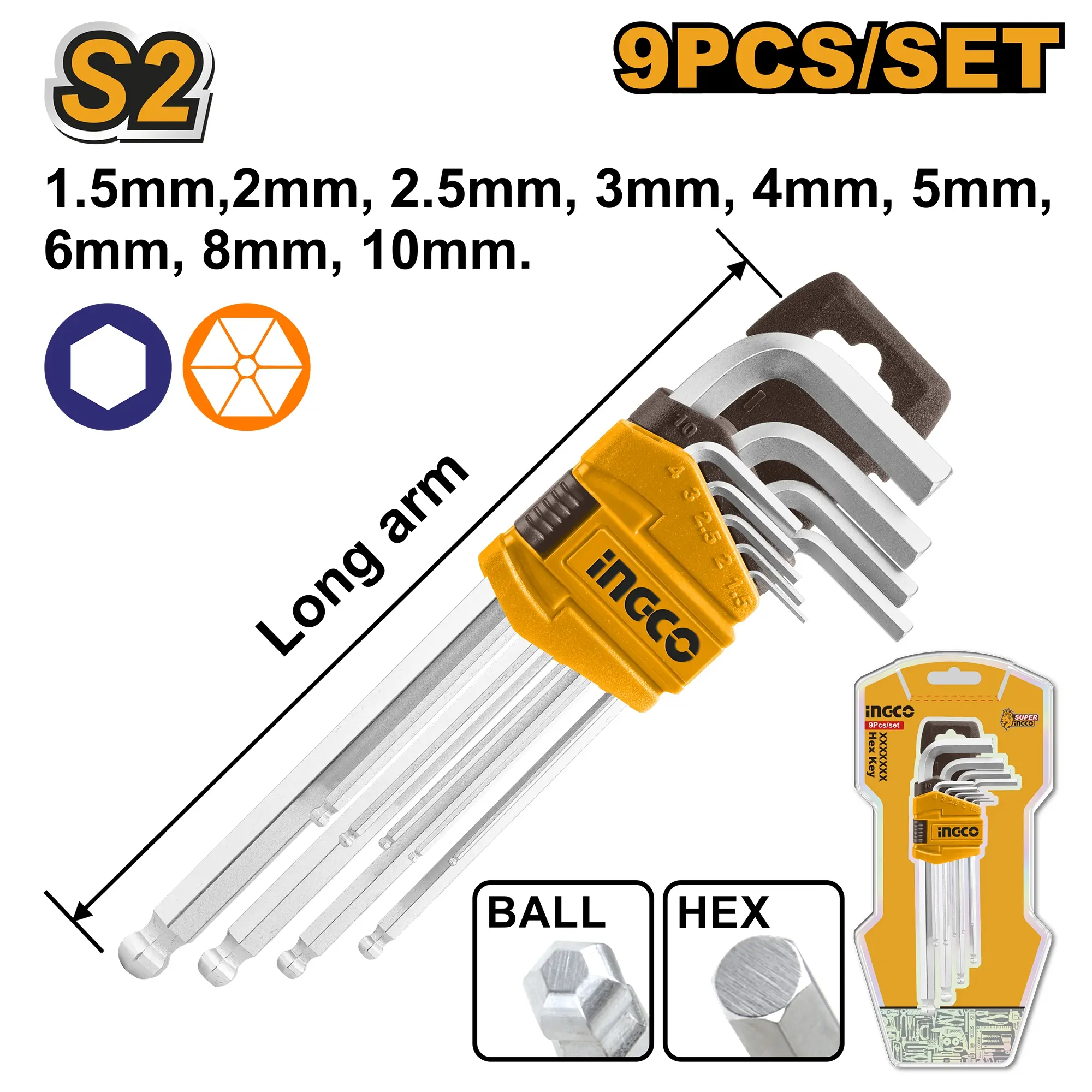 Sada devíti imbusových klíčů s kuličkou je určena pro přístup do šestihranných (hexagonálních) otvorů pod různými úhly. Kuličková koncovka umožňuje práci pod úhlem až 25–30°, což usnadňuje práci v těsných prostorech a obtížně dostupných místech. Sada obsahuje všechny běžně používané velikosti od 1,5 mm do 10 mm (1,5, 2, 2,5, 3, 4, 5, 6, 8, 10 mm), což pokryje většinu domácích a profesionálních aplikací. Materiál S2 (zušlechtěná ocel) s tvrdostí cca 58 HRC zajišťuje vysokou odolnost a dlouhou životnost. Dlouhé rameno umožňuje přístup do hlubokých otvorů a lepší dosah. Tepelné zušlechtění a chromovaná povrchová úprava zajišťují ochranu před korozí a elegantní vzhled. Sada je kompaktní a snadno přenosná. Ideální pro mechaniky, údržbáře, elektrikáře a domácí kutily. Baleno ve dvojitém blistru.