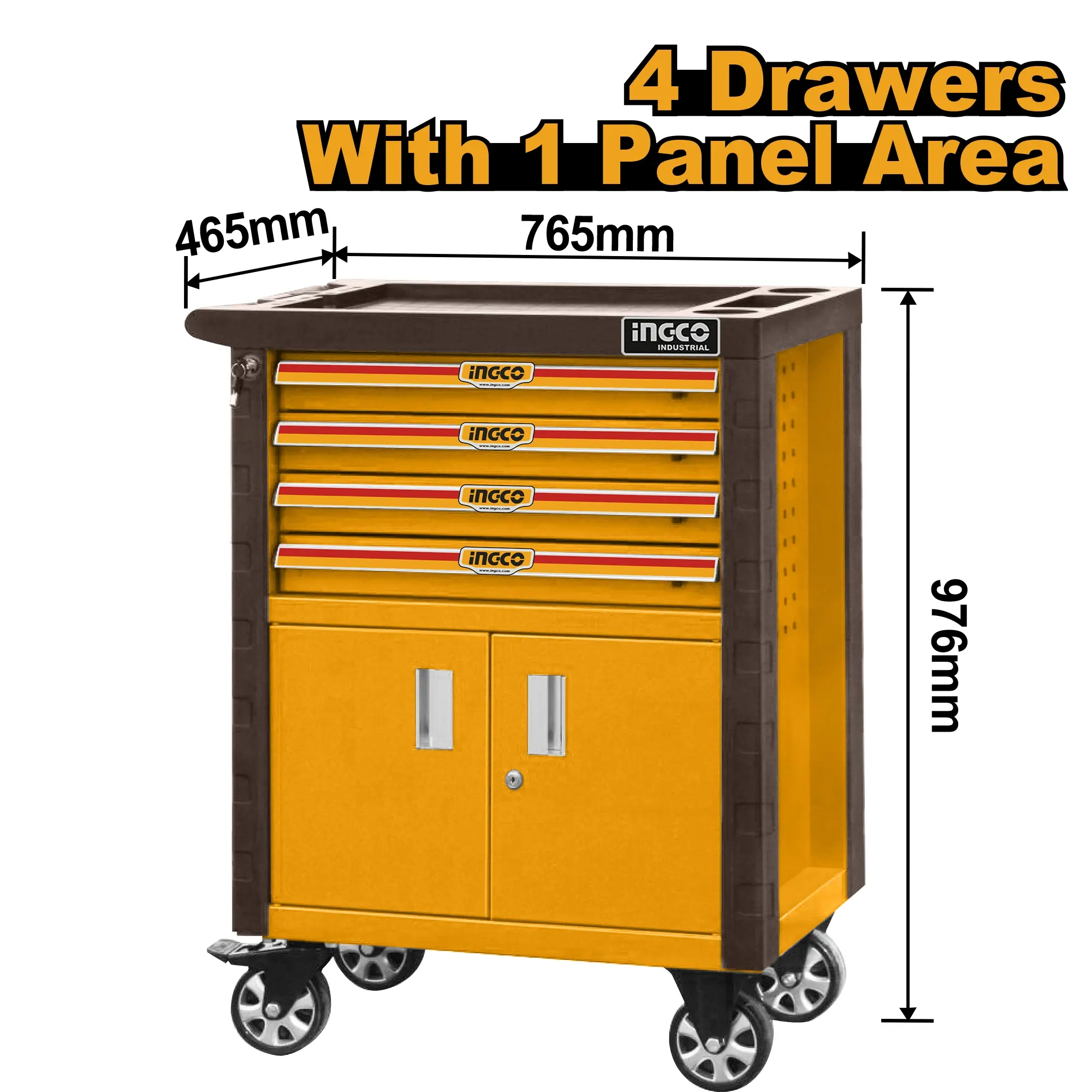 Tato pojízdná skříňka nabízí čtyři prostorné zásuvky o rozměrech 536 × 410 × 74,5 mm, které jsou ideální pro uskladnění nářadí a dílenských pomůcek. Celkové rozměry skříňky jsou 765 × 465 × 812 mm, s kolečky pak 765 × 465 × 976 mm, což zajišťuje pohodlnou mobilitu. Kolečka o velikosti 5" × 2" usnadňují přesun, zatímco tloušťka korpusu 0,8–1,0 mm a zásuvek 0,7 mm zaručuje pevnost a odolnost. Skříňka je vybavena centrálním zamykacím systémem pro maximální bezpečnost uložených nástrojů a ochrannými prvky proti nárazům. Zásuvky jsou osazeny kvalitními kuličkovými ložisky pro hladký chod.