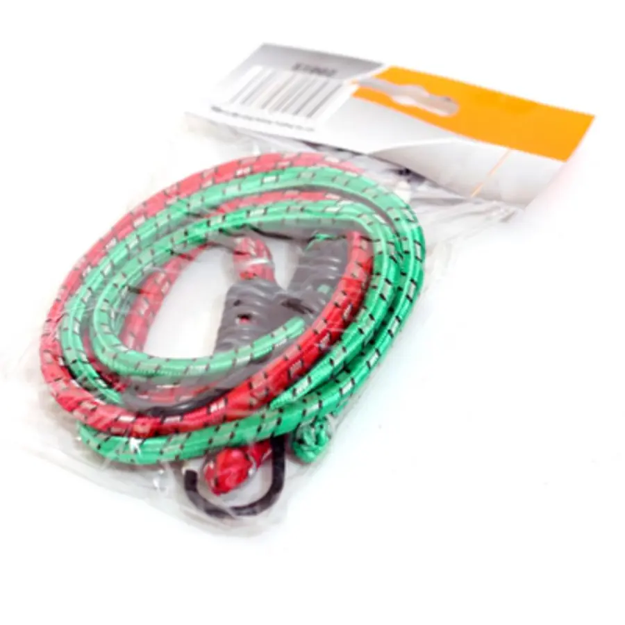 elastické upínací gumové popruhy, délka 100 cm, tloušťka 10 mm, sada 2 kusů, jsou opleteny polyesterem a na obou stranách zakončeny háčky z ocelových potažených drátů, které slouží k upevnění zavazadel.