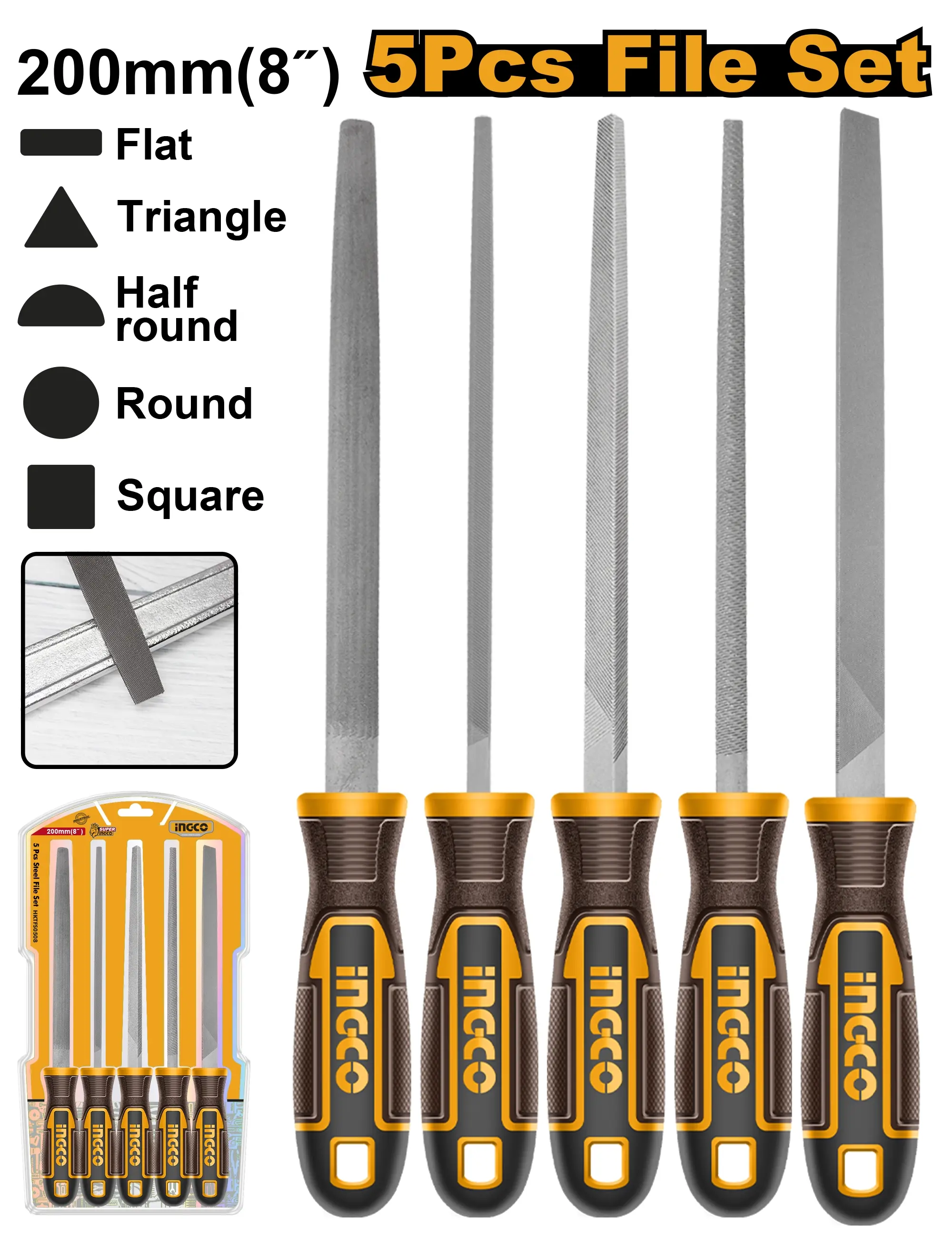 Sada zahrnuje pilníky o délce 200 mm (8") v pěti tvarech – plochý, půlkulatý, kulatý, trojhranný a čtvercový. Každý tvar je optimalizován pro konkrétní typ práce – opracování ploch, zaoblení, otvorů a drážek. Kompletní řešení pro profesionály i kutily. Baleno ve dvojitém blistru.