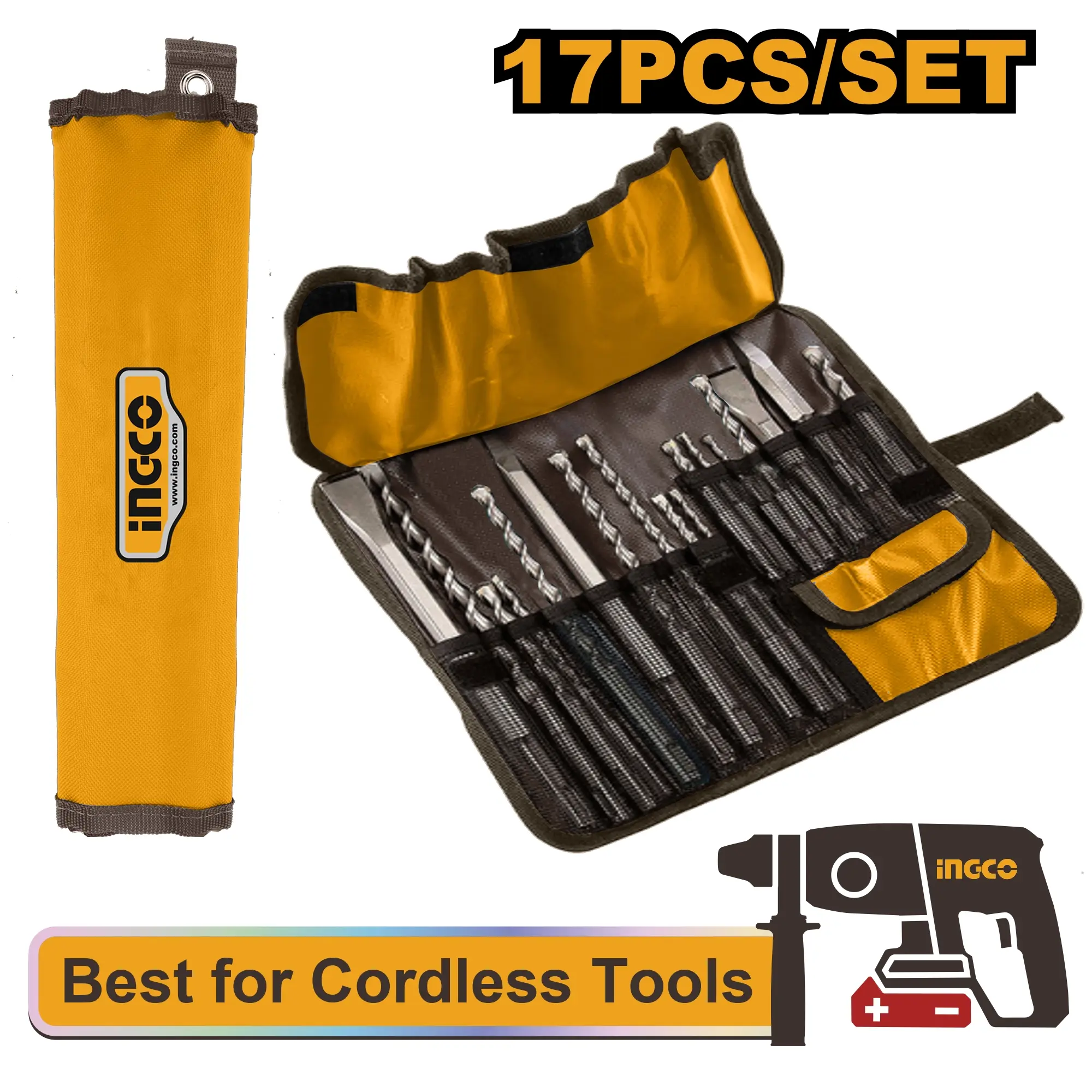 Sada obsahuje širokou škálu vrtáků od průměru 5 mm do 14 mm v různých délkách (až do 260 mm), což pokryje většinu běžných potřeb při kotvení, instalacích i provrtávání silnějších stěn. Dále zahrnuje čtyři sekáče (špičaté a ploché) ve dvou délkách pro přesné i hrubší sekání. Vše je přehledně uloženo v odolném rolovacím plátěném pouzdře, které je lehké, skladné a chrání nástroje při transportu.