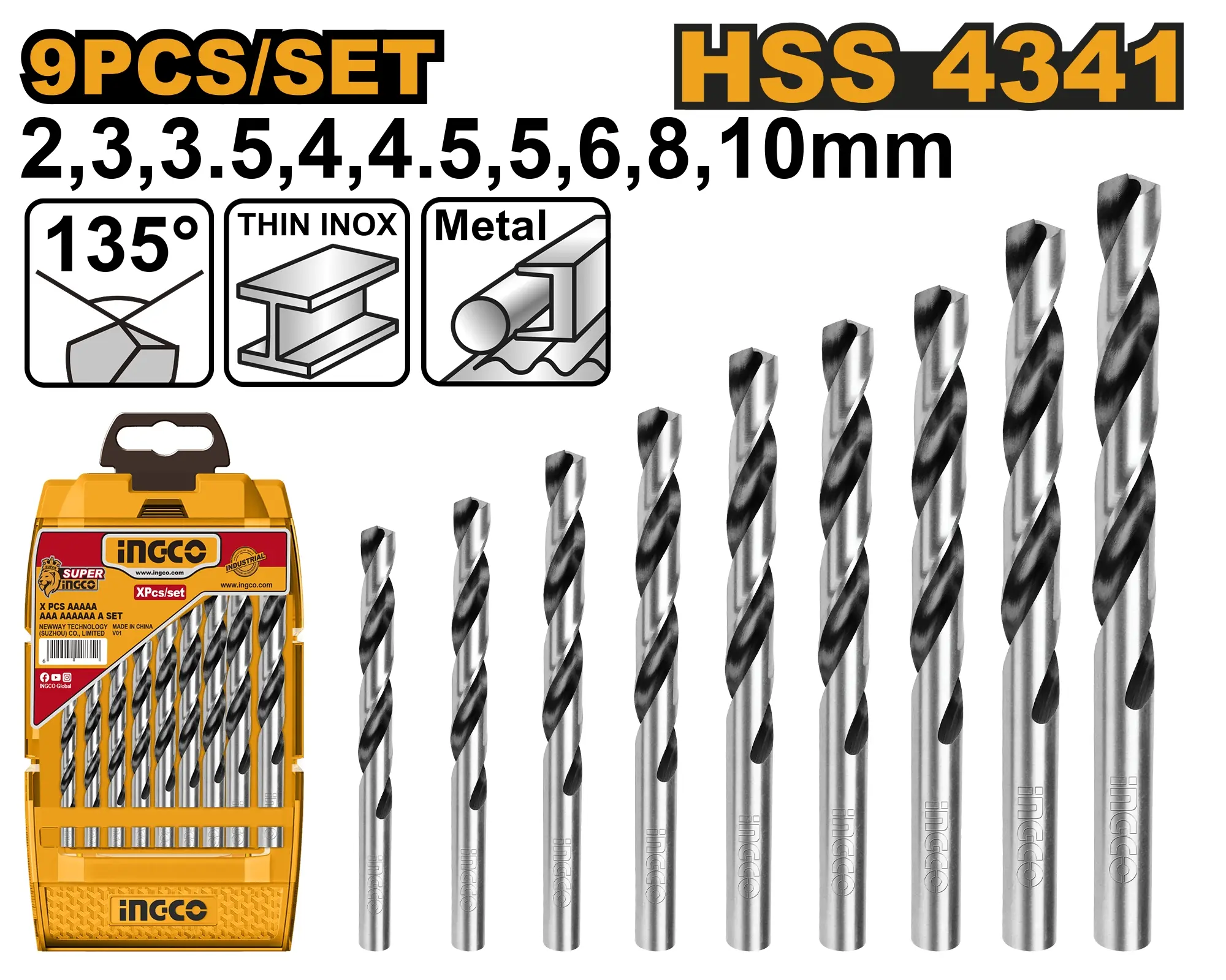 • Sada obsahuje: 9 ks HSS 4341 spirálových vrtáků v následujících velikostech: 2 mm, 3 mm, 3,5 mm, 4 mm, 4,5 mm, 5 mm, 6 mm, 8 mm, 10 mm